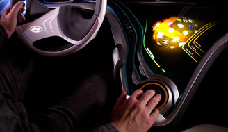 A sculpted, superwide multitouch multiscreen system featuring a very nonrectangular interaction design for the concept car HED-7 ‘iFlow’ by Hyundai’s European Design Center.